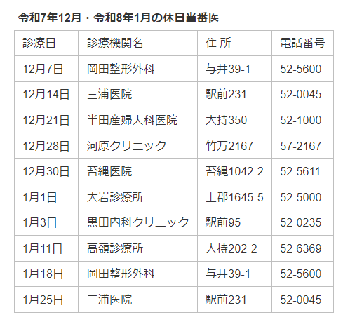 令和7年12月、R8年1月の休日当番医をお知らせします。 受診をされる前に各診療機関に直接お問い合わせ下さい。【お問い合わせ】上郡町健康福祉課健康係(電話:0791-52-2188)